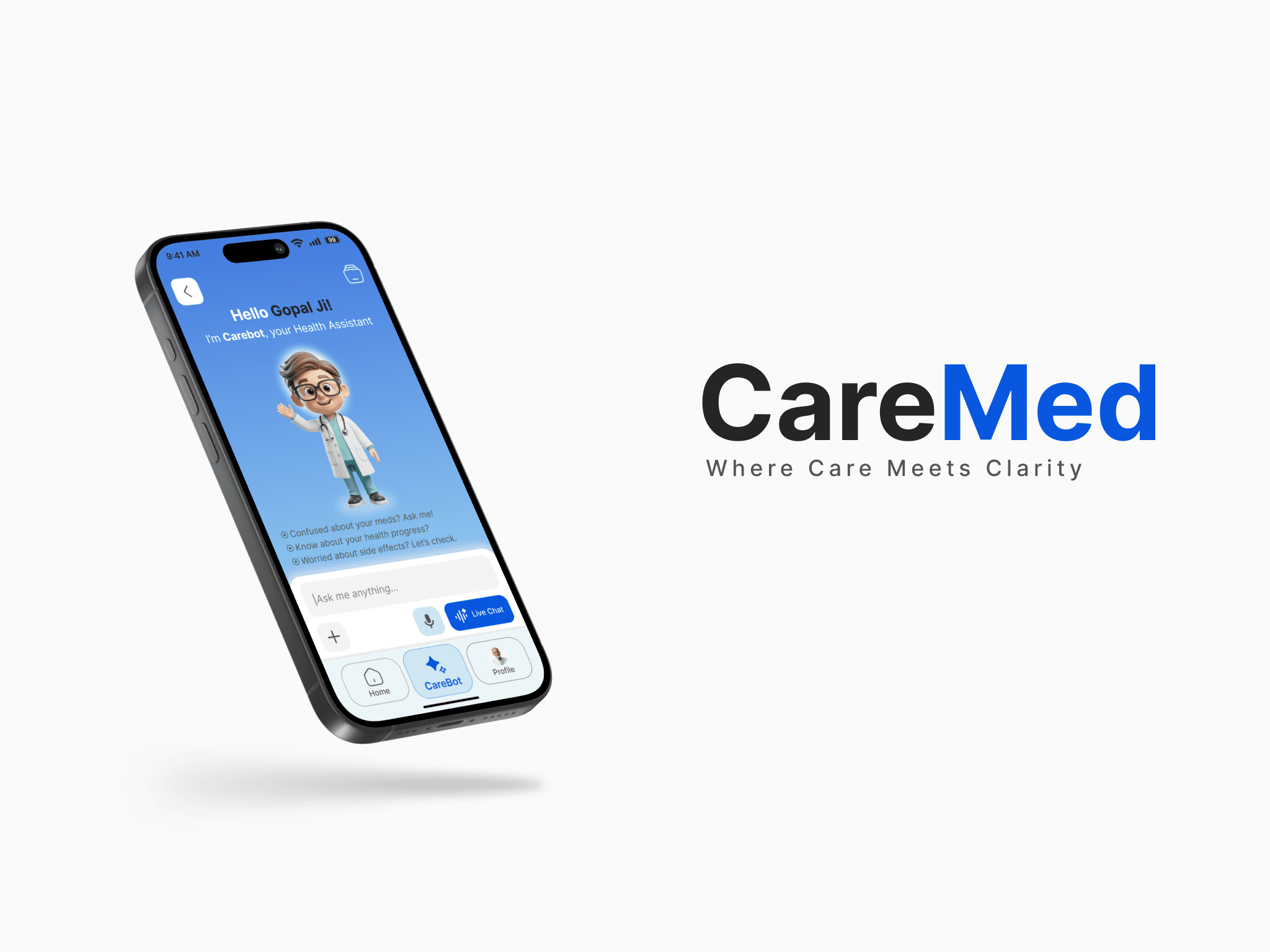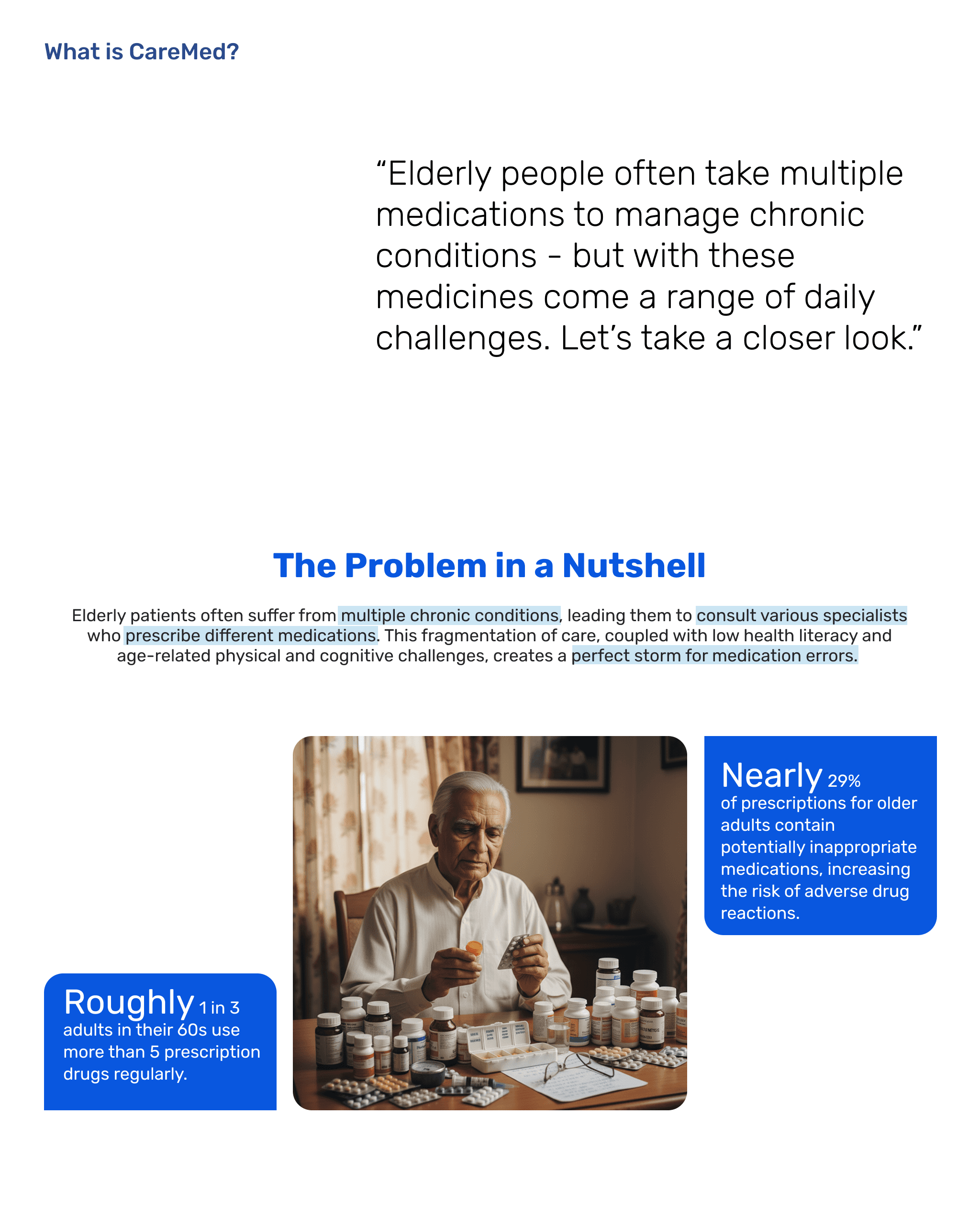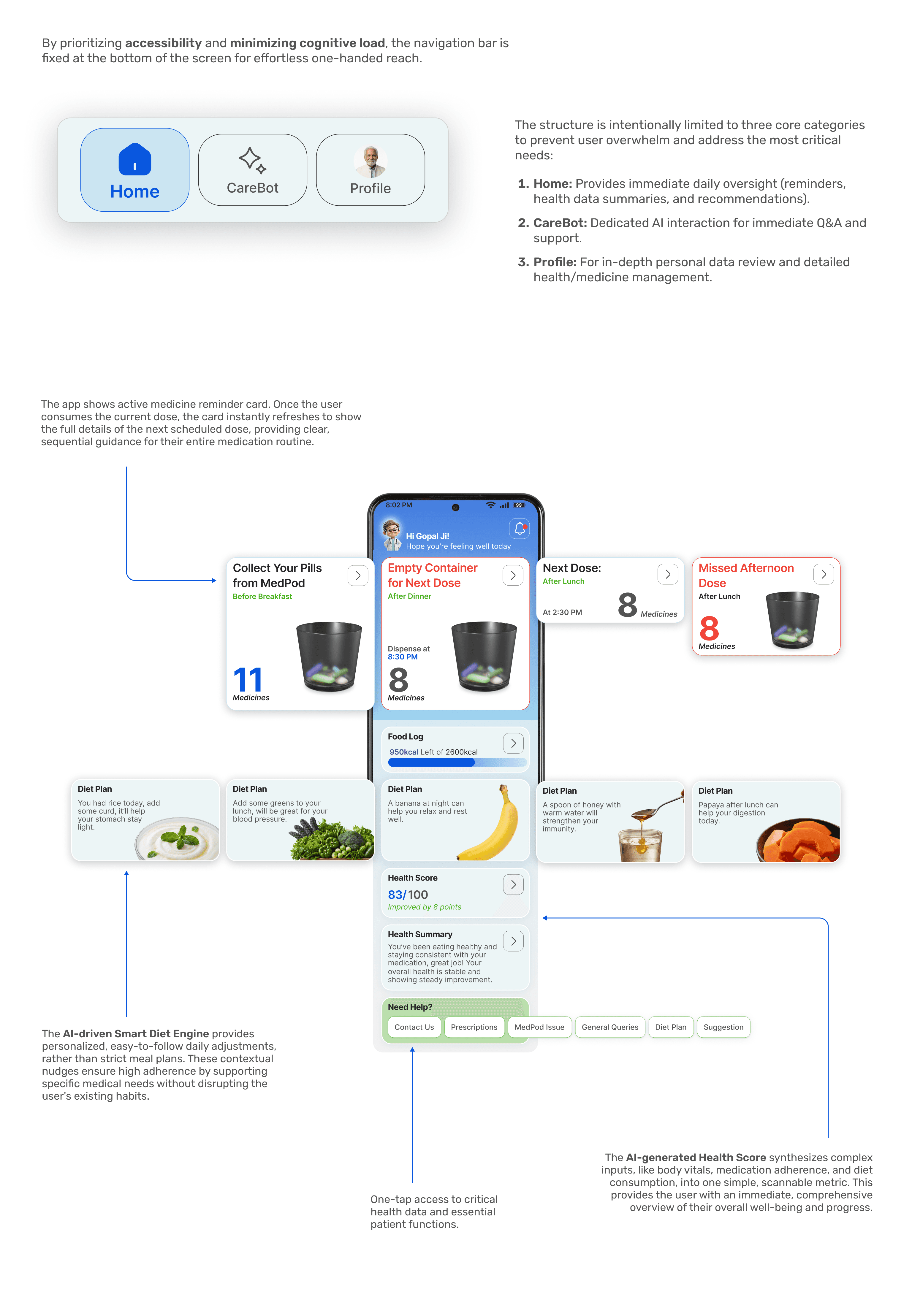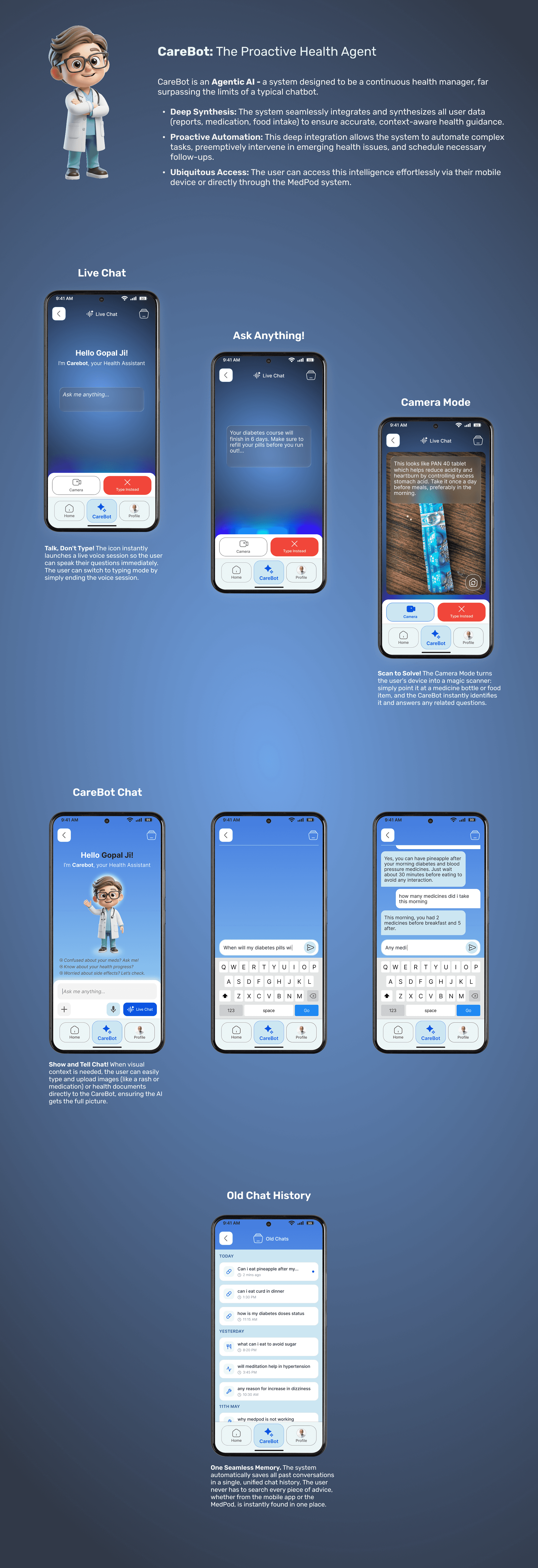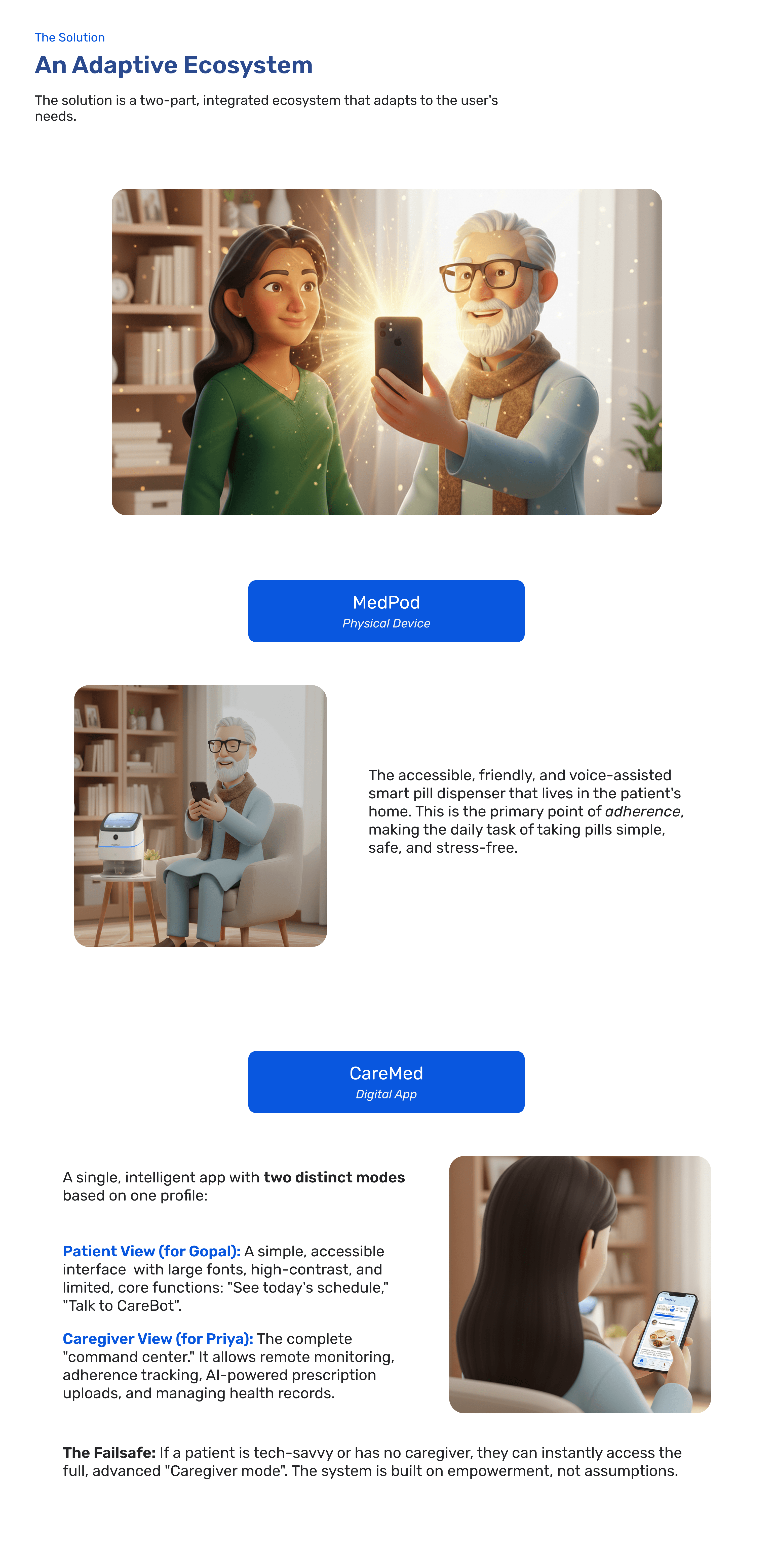 CareMed is a unified health management solution designed for elderly users managing multiple medications. It seamlessly connects a mobile app with a smart device (MedPod) to simplify pill consumption, reduce confusion, and provide instant voice-based support. The system also empowers caregivers to monitor medication adherence and overall health, creating a complete ecosystem for those with heavy medication routines.