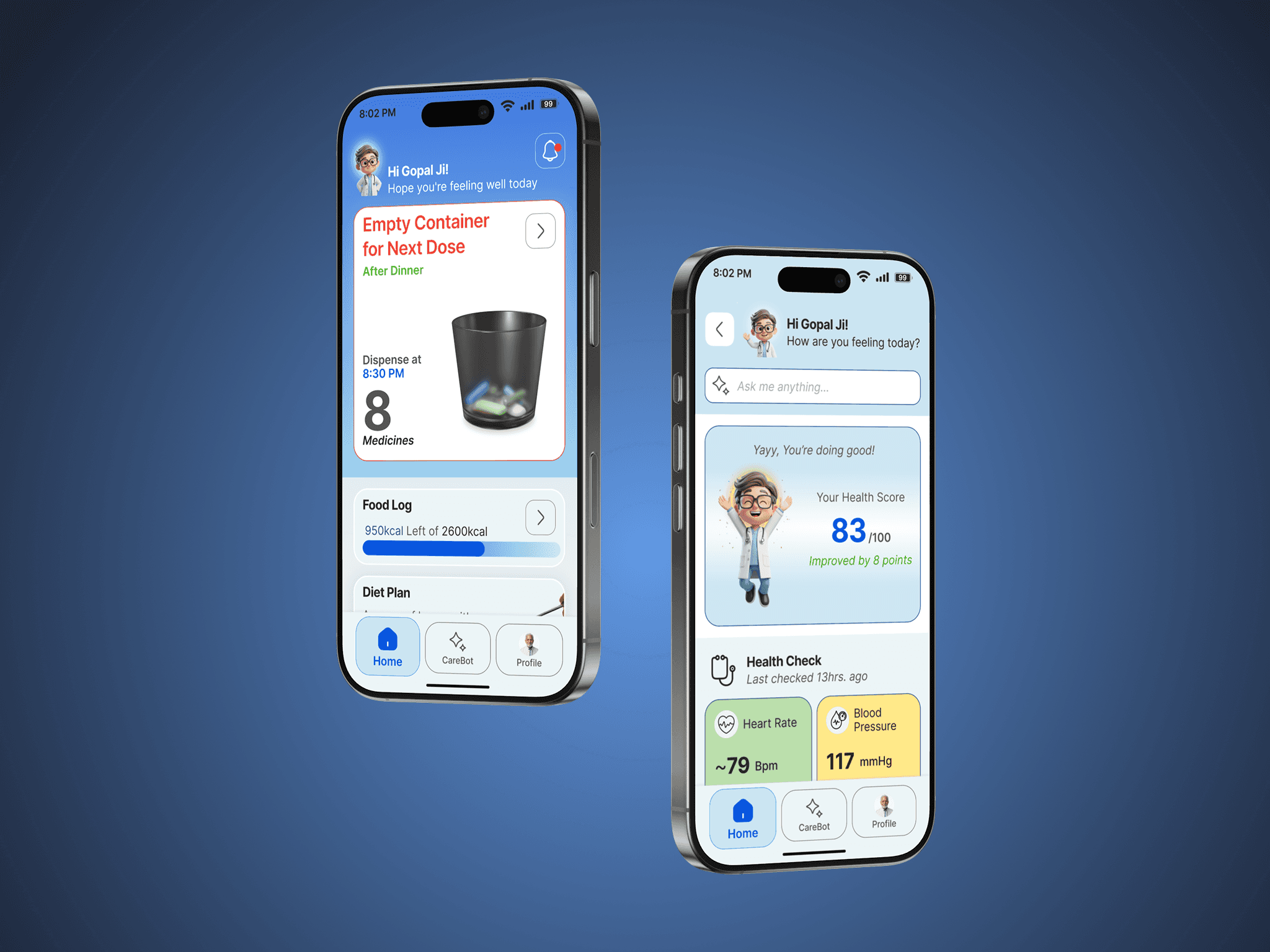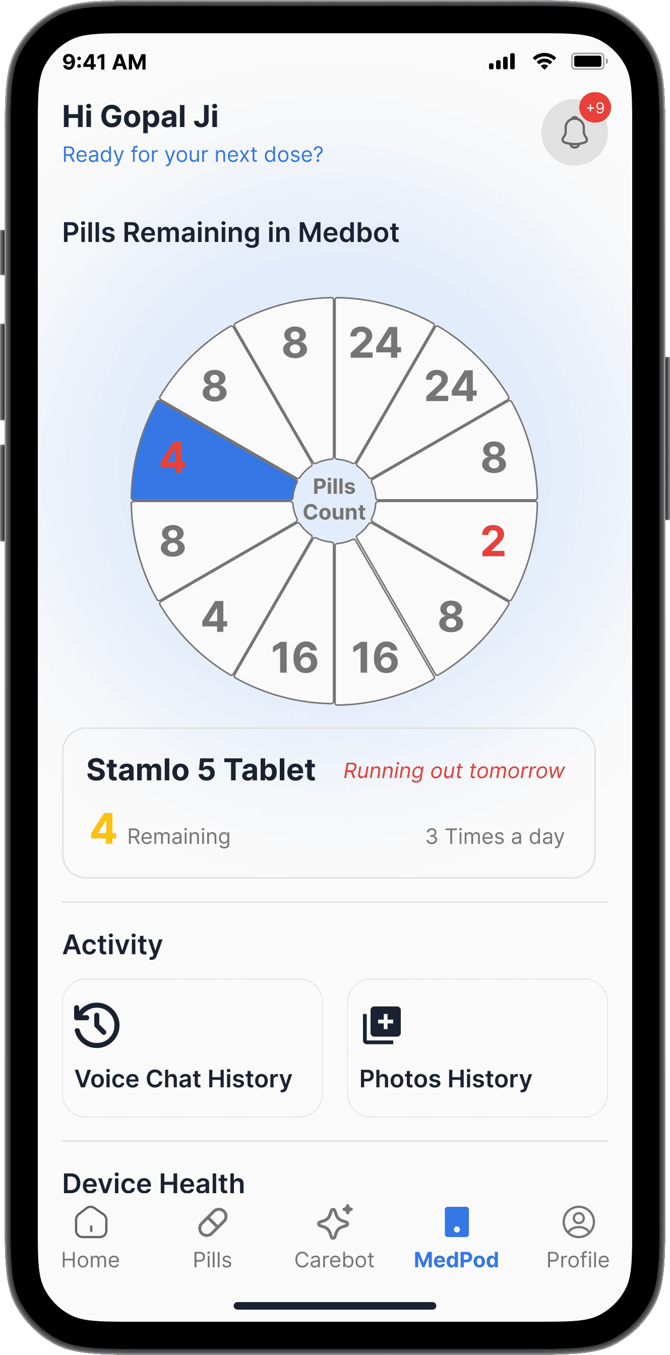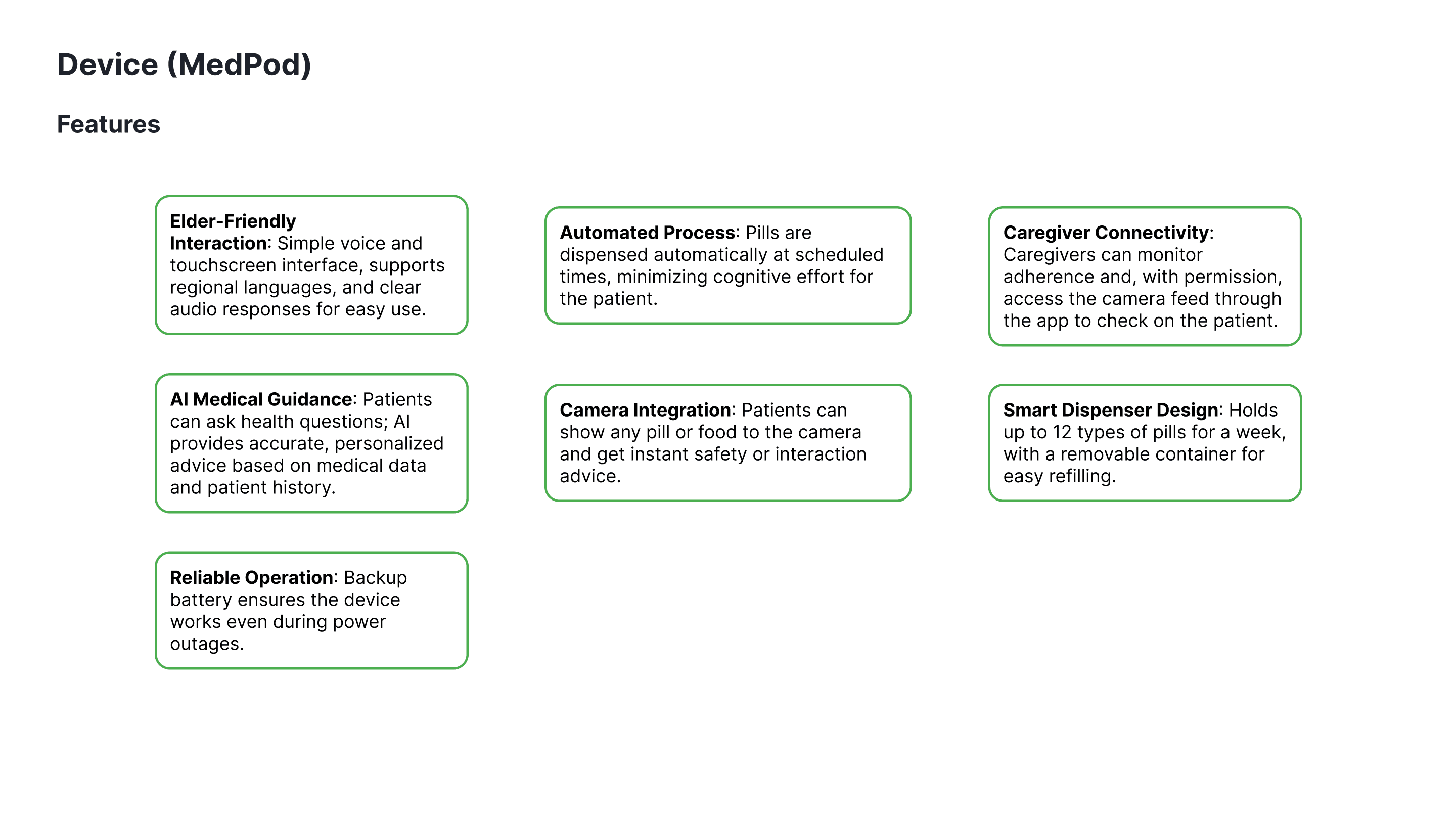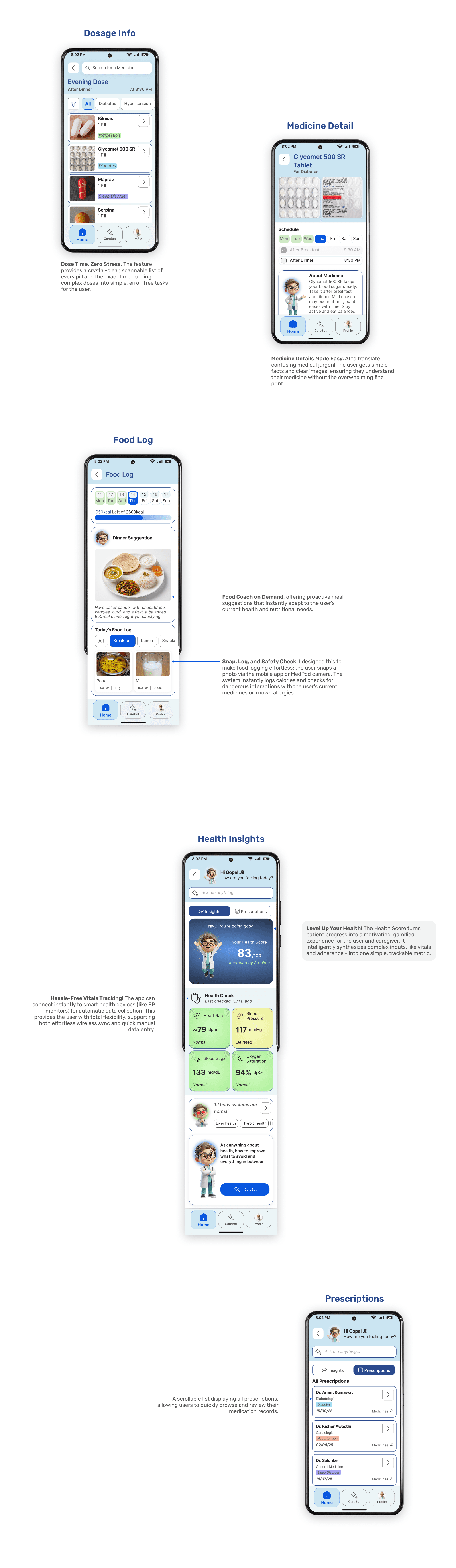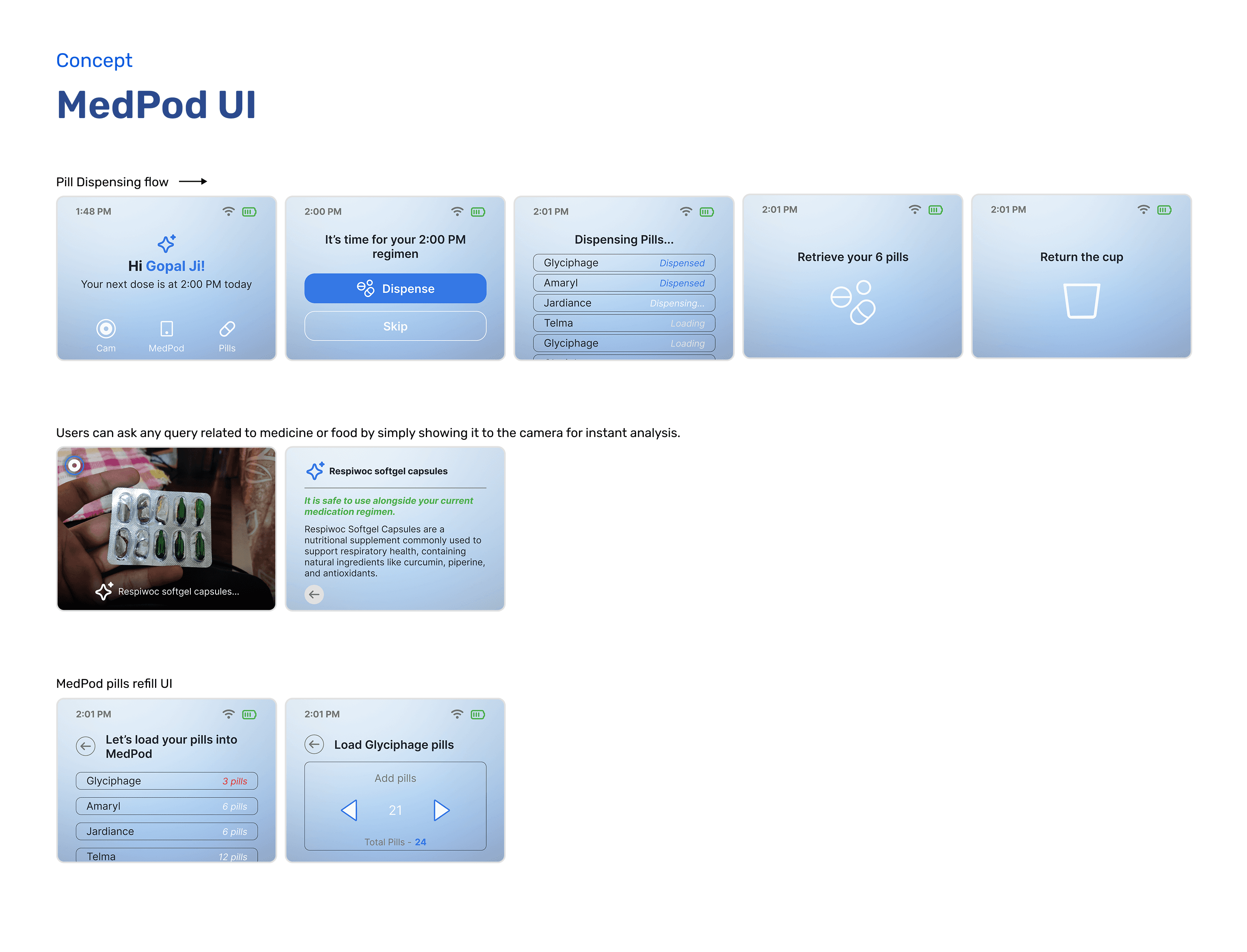 CareMed is a unified health management solution designed for elderly users managing multiple medications. It seamlessly connects a mobile app with a smart device (MedPod) to simplify pill consumption, reduce confusion, and provide instant voice-based support. The system also empowers caregivers to monitor medication adherence and overall health, creating a complete ecosystem for those with heavy medication routines.
