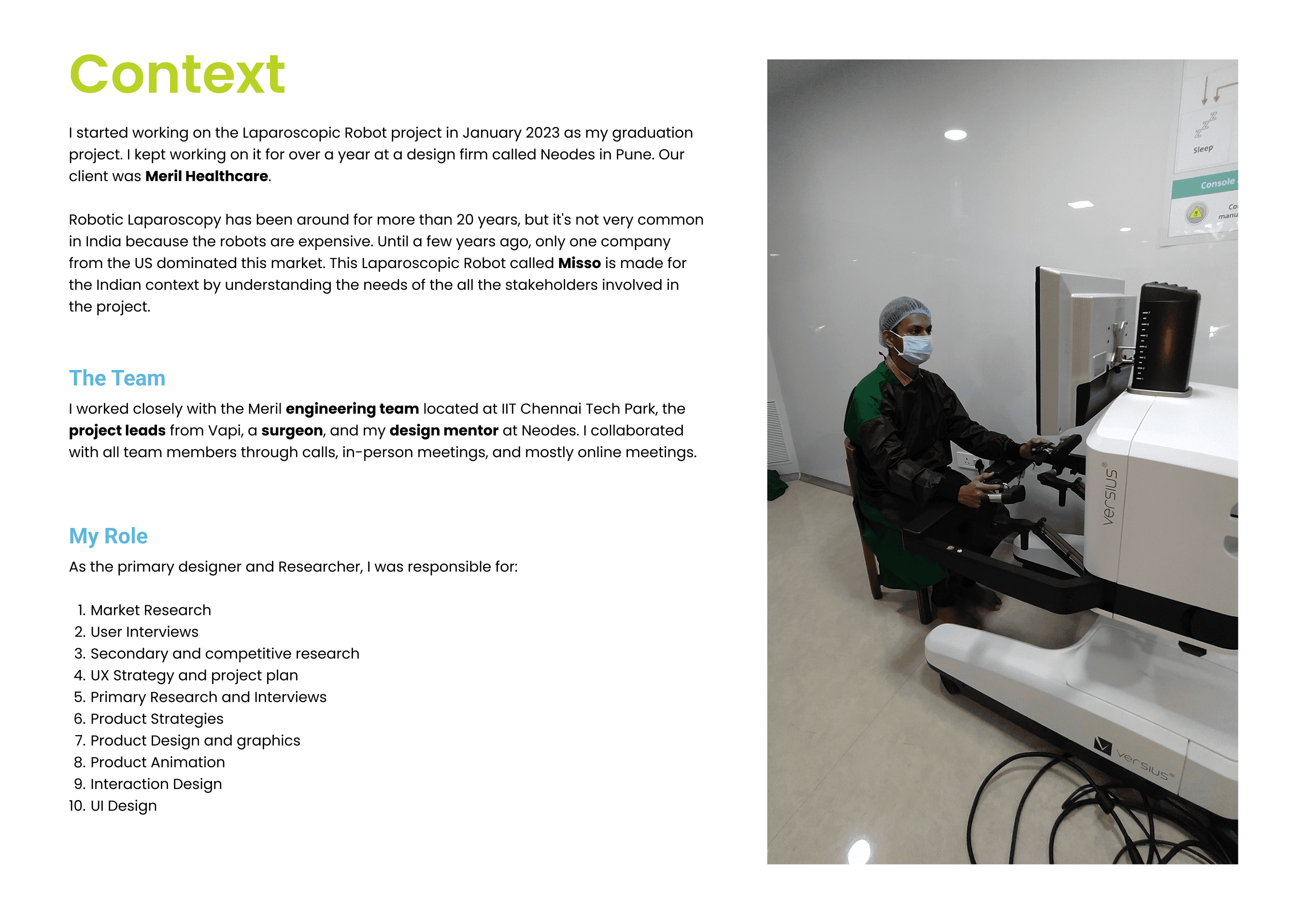 I began this project as the sole designer, conducting extensive research to evaluate the robot’s market fit in India. Collaborating closely with the engineering team at IIT Madras, I guided the design direction through insights, usability feedback, and feature recommendations under Sr. Designer. I also assisted the Sr. Designer in shaping the robot’s final form and functionality. Throughout the process, I worked with doctors, patients, engineers, the marketing team, and Meril Healthcare’s leadership to ensure the design aligned with real-world needs. The robot is now in clinical trials and expected to enter the market in the coming years.