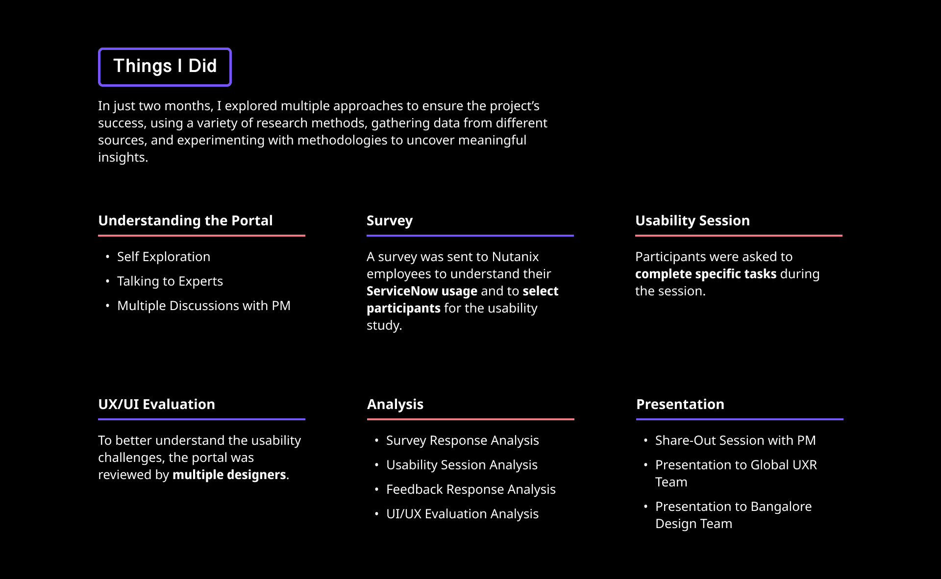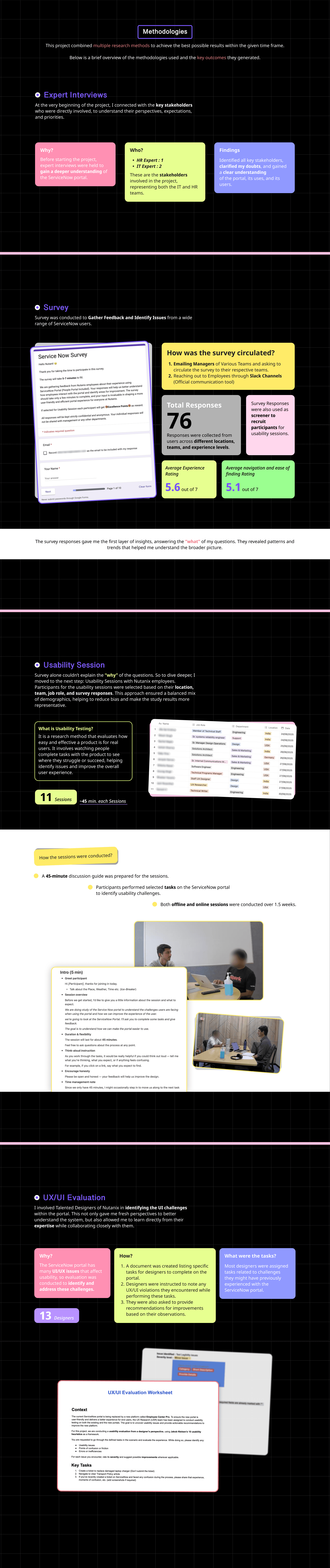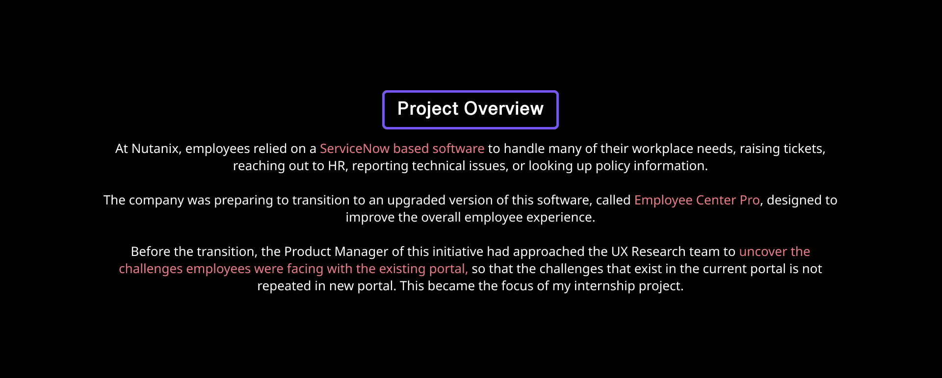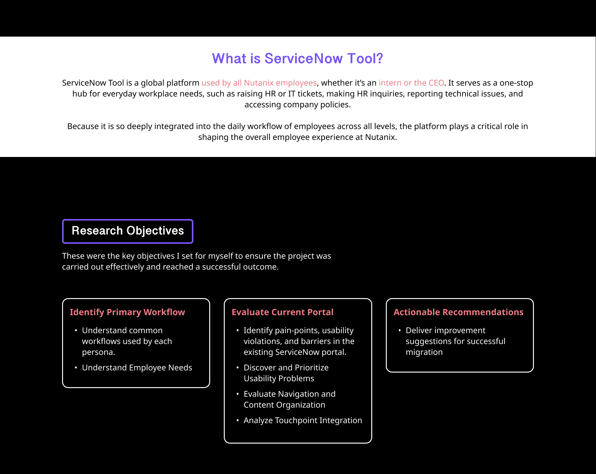 6-week UX research project at Nutanix focused on identifying employee pain points in the existing ServiceNow portal ahead of its transition to Employee Center Pro.